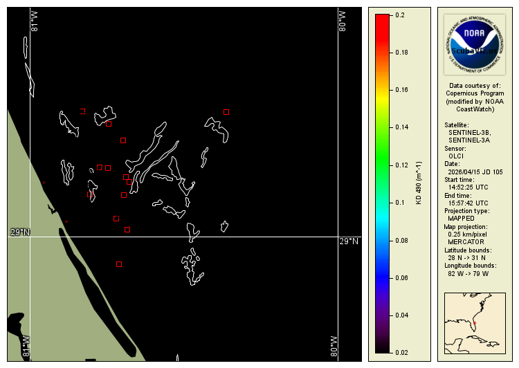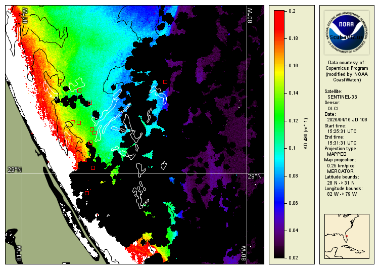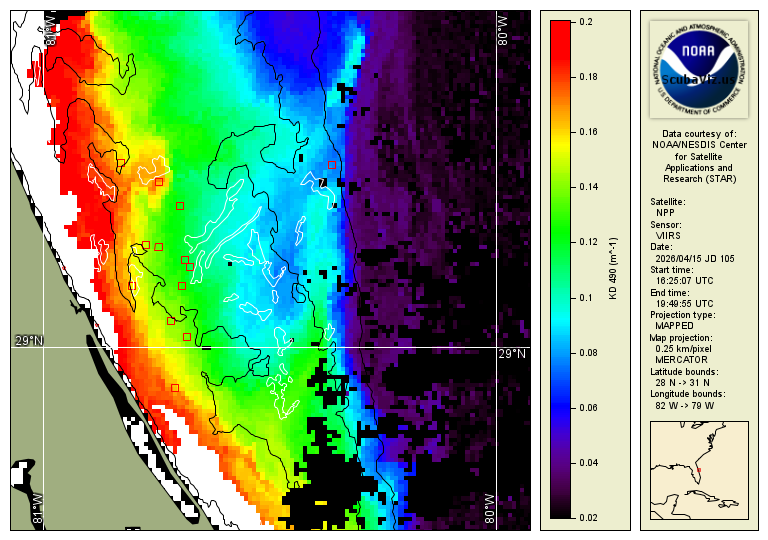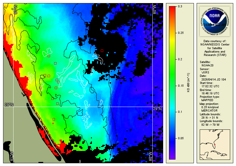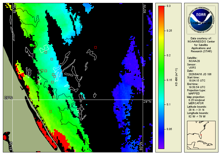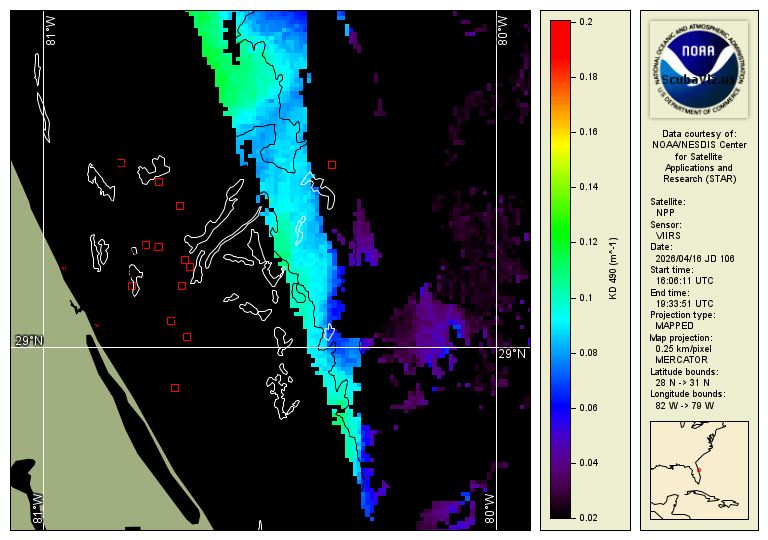 These images show the measured "Kd" value (diffuse attenuation coefficient). Studies have shown that this is a good analog to represent light attenuation and water clarity. This is a calculated value based on the amount of 490nm blue light as seen from space. These are 3 different satellites that pass over daily. The relevant data range is based on what has been determined to be relevant based on in situ diver reports.