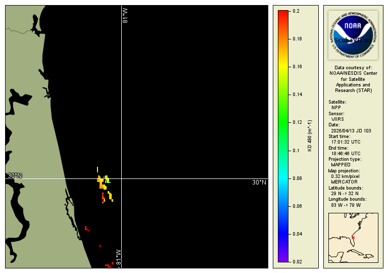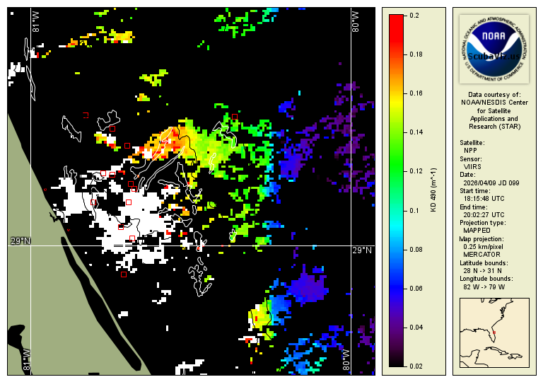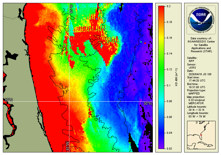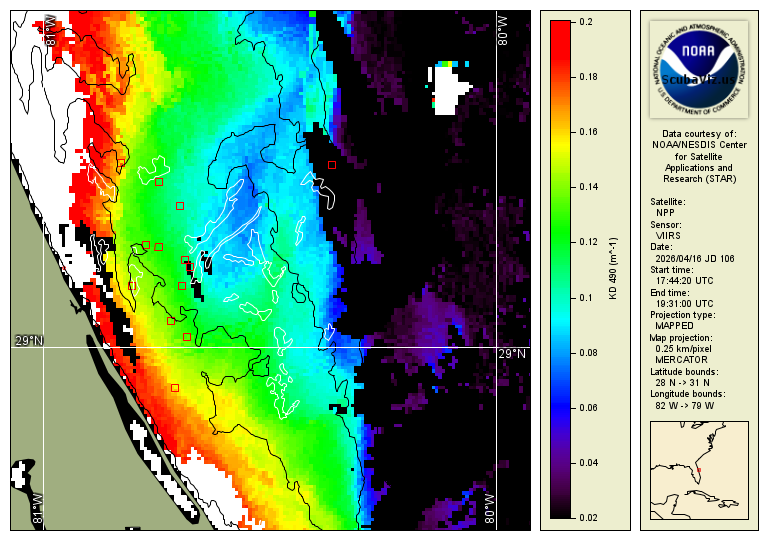 These images show the measured "Kd" value (diffuse attenuation coefficient). Studies have shown that this is a good analog to represent light attenuation and water clarity. This is a calculated value based on the amount of 490nm blue light as seen from space. These are 3 different satellites that pass over daily. The relevant data range is based on what has been determined to be relevant based on in situ diver reports.