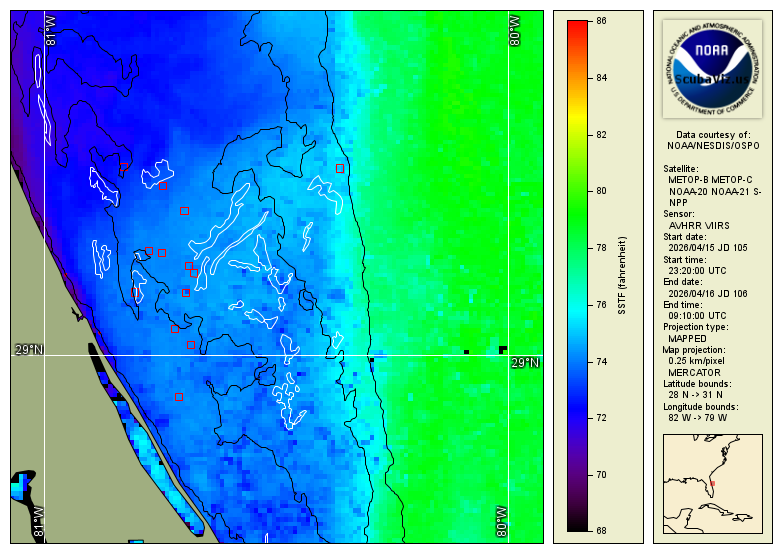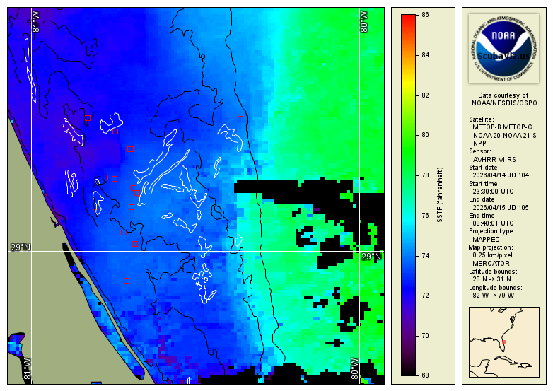 This satellite data product is updated daily at 3am EST. It is a composite of satellite images from the previous afternoon. If there are clouds on some of the images or the SST is changing significantly during the day it may result in unusual anomalies in the image. For more precise analysis of SST use the individual SST images listed here:Volusia AVHRR SST